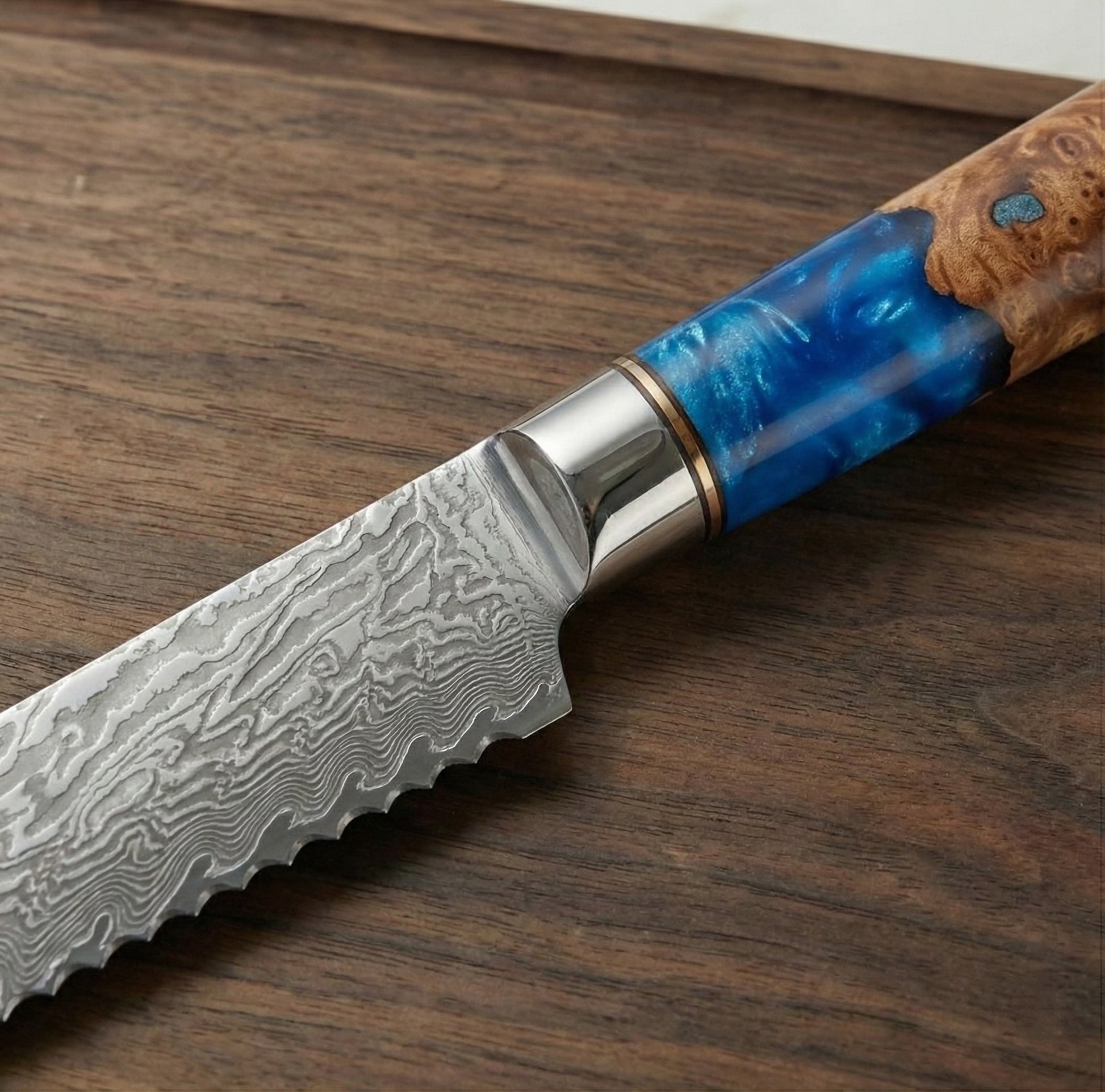 The "Ocean Azure" Ergonomic Handle The striking handles are a fusion of imported deep-sea resin and stabilized color wood, mimicking the shifting depths of the ocean. Designed with a unique ergonomic taper, they fit the palm naturally to eliminate fatigue during extended use. Finished with rust-proof double copper rings, they are as durable as they are beautiful.