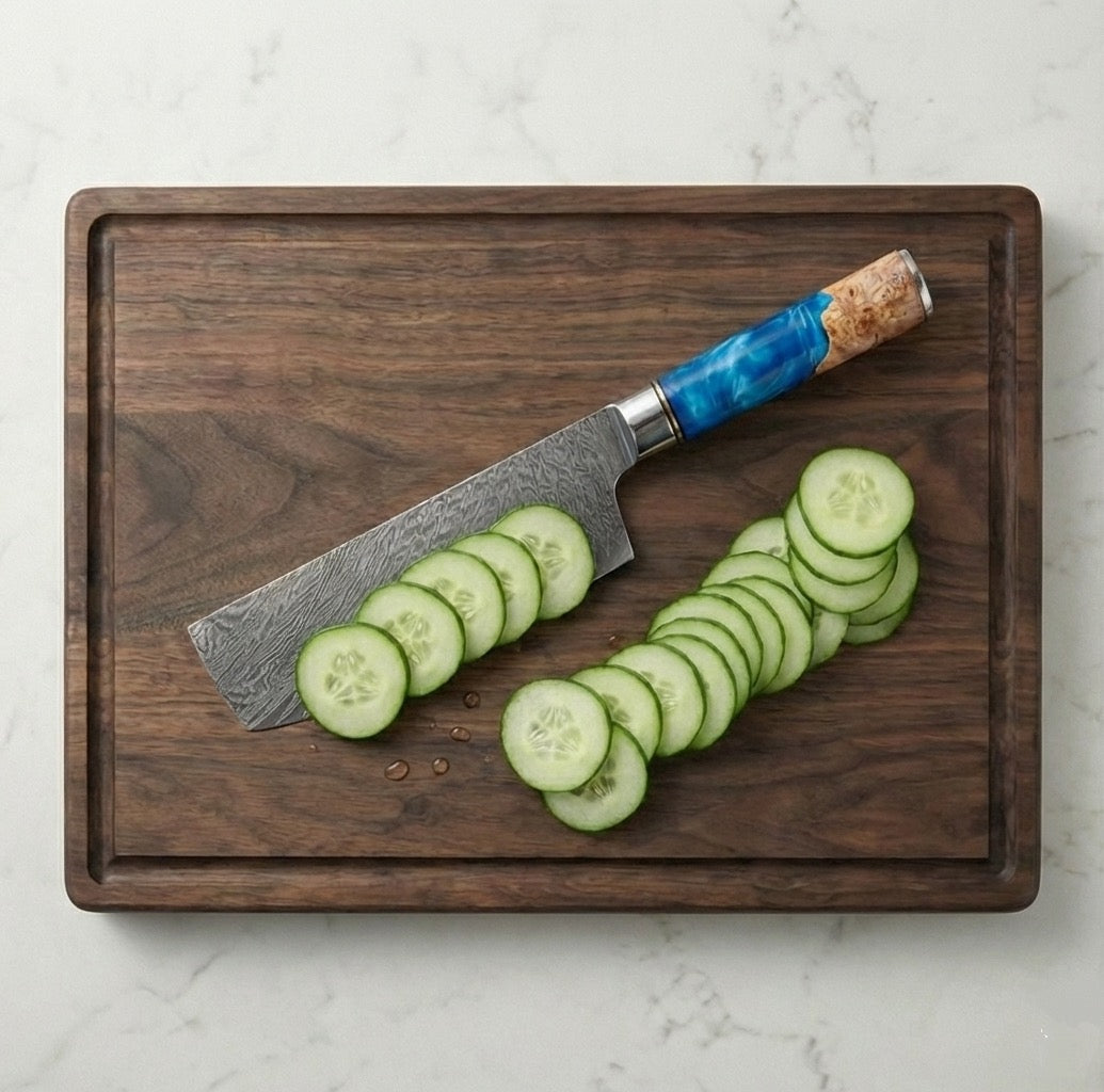 7" Japanese Nakiri: The vegetable specialist. Its flat edge allows for precise, clean "push-cuts" without rocking—perfect for paper-thin slices.